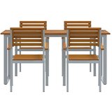 Ovaj set za blagovanje od 5 komada sastoji se od čvrstog stola od akacije i metalnih stolica, dizajniran da uljepša obroke na otvorenom. Kombinacija prirodnog drva i čvrstog metala idealna je za ugodne večere na balkonu ili terasi.