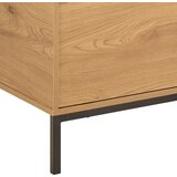 TV stol nudi praktičan prostor za pohranu u obliku otvorenog pretinca, ladice i dva ormarića. Crno postolje obloženo prahom izrađeno je od čelika i savršeno nadopunjuje glatku površinu u izgledu divljeg hrasta. Zahvaljujući mehanizmu otvaranja na pritisak, koji ne zahtijeva ručke, održava se minimalistički izgled.