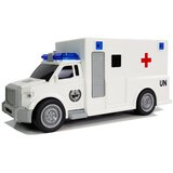 Ambulance with friction drive white 1:20 with soundInteractive toy A medical ambulance is needed by every rescue team. It will probably be used by a small future doctor, paramedic or driver. Thanks to the ambulance, the little doctor will be able to feel like a real professional. Perfectly mapped ambulance. The vehicle has sounds and lighting effects, activated by a button located on the vehicle's roof. The car has a power friction drive. The car is light and nicely made. The vehicle has rubber wheels. The ambulance is made in 1:20 scale.Ambulance dimensions:19.5 cm x 7 cm x 8.5 cmBox dimensions:24 cm x 11 cm x 16 cmThe car is powered by three "AG13 / LR44" batteries (included). The toy is intended for children over 3 years of age. The ambulance has a CE certificate and complies with the EN 71 standard. It is packed in a cardboard box, making it perfect for a gift.