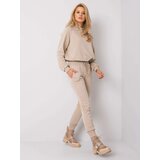 Beige tracksuit set. The set includes: sweatshirt, pantsMaterial: 90% cotton, 10% elastanewashing method: machine wash at 30CThe model is wearing a size S. Model's measurements: height 175 cm, bust 85 cm, waist 63 cm, hips 95 cm. Dimensions of the set in size S measured flat: width under the armpits 55 cm, sweatshirt length 56 cm, sleeve length 63 cm, waist width 34 cm, pants length 93 cm