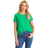 Women's cotton tshirt basic green. Material: 90% cotton, 10% elastanewashing method: machine wash at 30C The model is wearing a size S. Model's measurements: height 175 cm, bust 84 cm, waist 65 cm, hips 92 cm.