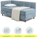 Dizajnerski kutni krevet za jednu osobu, s madracem s džepićastim oprugama, praktičnim prostorom za odlaganje i varijabilnim uzglavljem koje se može postaviti na lijevu ili desnu stranu. Izuzetno jednostavna montaža, visokokvalitetni, izdržljivi materijali i velika nosivost čine ga idealnim izborom za svakodnevno korištenje i elegantan interijer. Svaki detalj izrađen je ručno u Češkoj , u maloj obiteljskoj tvrtki s više od 15 godina iskustva. Rezultat je spoj iskustva, lokalne izrade i modernog dizajna, na koji se možete osloniti svaki dan. Prednosti kreveta Bonami Selection: čvrst i snažan okvir za maksimalnu stabilnost i izdržljivost, samonosiva konstrukcija bez oslonaca, bez škripanja, izdržljiva presvlaka veće gustoće tkanine, OEKOTEX certifikat, prihvatljiva za kućne ljubimce, mekani rubovi, kvalitetno tapeciranje, sve uredno presvučeno, praktične ručke za lak pristup prostoru za pohranu, laminirane ploče veće otpornosti, mogućnost odabira lijevog i desnog kuta, precizno izrađeni dijelovi za montiranje koji traju i izgledaju dobro u isto vrijeme. Krevet Bonami Selection možete sastaviti za 30 minuta . Zahvaljujući dobro osmišljenom dizajnu, jasnim uputama i videu sastavljanja, cijeli proces je brz, jednostavan i, što je najvažnije, bez stresa. U spremište nosivosti 30 kg stane sezonski tekstil, rezervna posteljina ili bilo što što želite imati pri ruci.