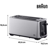 Braun HT5220BK Toster sa dugim otvorima Proizvode osobine 2 dodatno duga otvoraSa dva dodatno duga otvora možeš istovremeno tostirati do 4 tosta ili 2 kriške kruha.Varijabilna smedenjaIzmedu 8 razlicitih postavki može se odabrati željena razina smedenja, neovisno o vrsti kruha.Integrirani dodatak za pecivaJednostavno zagrijavanje ili tostiranje cijelih peciva.Ponovno grijanje i odmrzavanjeImaš više kontrole nad željenom razinom smedenja prilikom zagrijavanja ili odmrzavanja tosta.Automatsko centriranje kruhaOsigurava da se kriška kruha uvijek nalazi u idealnom položaju u tosteru i ravnomjerno se zapece.Pametno reguliranje temperatureOmogucava ravnomjerne rezultate smedenja kroz više ciklusa tostiranja.Jednostavno vadenjeLako vadenje cak i malih kriški kruha.Tehnicki podaciBroj otvora za tostiranje: 2 dugih otvoraVarijabilne razine smedenja: 8Rucna funkcija podizanjaIntegrirani dodatak za pecivaIzvadiva ladica za mrviceNamotavanje kablaSistem centriranjaFunkcija prekidaFunkcija zagrijavanjaFunkcija odmrzavanjaOsvijetljene tipkeAutomatski izbacivanjeSnaga: 1.470 WDimenzije proizvoda (DxŠxV): 40,4 x 16,5 x 18,8 cmTežina proizvoda: 2,18 kg