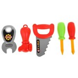 prijenosni rasklopivi kofer auto na kotačima, gornji dio s mogućnošću uvrtanja vijaka, 2 bočne police, vješalica za alat, kružna pila, ručna lopta, 2 odvijača, čekić, ključ, 3 zupčanika (1 veći i 2 manja), 2 konektora, 6 obloga, 6 vijaka, šareno pakiranje, idealno za poklon.Dimenzije kofer oko 26,5 cm x 21 cm x 9,5 cm, pakiranje oko 27 cm x 21 cm x 10 cm, kružna pila oko 20 cm, alat (prosječne dimenzije) cca. 8,5 cm, vijci oko 5,5 cm.