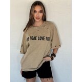 Women's Tshirt with BONGANIR printLet every day be filled with love with the BONGANIR Tshirt. With a round neckline and unique slits, this tshirt is more than just an outfit it's a way to express yourself and your feelings. The "LOVE" message on the front is not only a fashion statement, but also a reminder of what is most important in life. Choose a tshirt that says the same thing as you.Color beige.Composition: 100% cotton. Model dimensions:Hips: 85 cmWaist: 68 cmBust: 87 cmHeight: 172 cmShoe size: 39Model wears size S