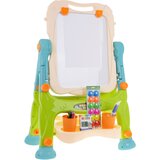 Opis2u1 ploča + priborDvostrana ploča s dva položaja na stalku s priborom za slikanje za djecu od 3 godine. Ploča je s jedne strane magnetna, a s druge strane kreda. Na bijeloj strani možete pisati olovkama koje su uključene u set, a zatim obrisati slike spužvicom. Bijela strana također se koristi za pričvršćivanje magneta u boji uključenih u set. Na bijeloj strani nalaze se i posebne kopče za pričvršćivanje listova papira na koje možete slikati. Možete slikati kredom na crnoj, kredastoj strani. U setu se nalazi poseban držač za držanje krede koji sprječava lomljenje krede i održava ruke naših mališana čistima. Također možete pričvrstiti magnete na crnu stranu. Ploča se može okretati za 360 stupnjeva i pažljivo je izrađena. Svi rubovi su zaobljeni kako bi se osigurala sigurnost korištenja. Set se lako sastavlja i rastavlja. Upute za sastavljanje na pakiranju. Set je opremljen ručkom za lakše prenošenje s mjesta na mjesto i osam nogu, 4 niže i 4 više.Dimenzije dimenzije korisne površine ploče (magnetnokredna površina): duljina cca. 40 cm, širina cca. 30 cm. daska na stalku s dužim nogama cca. 111 cm x 52 cm x 40 cm, daska na stalku s kraćim nogama cca. Visina 82 cm, polica cca. 36 cm x 38 cm, šalica cca. 8,5 cm, marker cca. 14 cm, hvataljka za kredu cca. 9,5 cm, spužva cca. 10 cm x 5,5 cm, magnet promjera 3 cm, kreda cca. 8 cm, stolica cca. 21 cm x 23 cm x 19 cm, paket cca. 62 cm x 50,5 cm x 17 cm.Sadržaj skupa stolica, podesiva ploča rotirajuća za 360 stupnjeva, izmjenjive noge duže, kraće, polica za pribor, pričvrsni vijci, 2 plastične čaše, 3 x brisivi marker (marker), 12 komada krede u boji, držač krede, 12 magneta u boji (2 x ružičasta, 2 x žuta, 2 x crvena, 2 x plava, 2 x narančasta, 2 x zelena), spužva s magnetom, 2 kandže za pričvršćivanje listova papira.