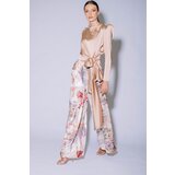 TABLICA S VELIČINAMA Široke hlače visokog struka izrađene od luksuznog satenskog materijala s elegantnim sjajem. Posebno se ističu bogatim orijentalnim uzorkom s motivima cvijeća i ptica, koji modelu daje profinjen i egzotičan karakter. Hlače imaju bočne džepove, skriveno kopčanje i širok kroj koji vizualno izdužuje figuru te pruža udobnost pri nošenju. Idealne su za svečane prigode ili kao statement komad u dnevnim kombinacijama.
