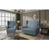 Set ukljuuje udoban dvosjed i elegantnu fotelju tipa 'uszak', koji se odlikuju visokim naslonima, prostranim sjeditima i udobnim naslonima za ruke. Precizna izrada i dekorativni avovi dodatno naglaavaju kvalitetu i estetiku namjetaja.