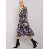 Navy blue patterned women's dress with a frill. Accessories: liningmaterial composition: 70% cotton, 30% polyesterwashing method: machine wash at 30CThe model is wearing one size. Model's measurements: height 170 cm, bust 73 cm, waist 60 cm, hips 85 cm. Measurements of the dress in size one size measured flat: armpit width 52 cm, total length 108 cm, sleeve length 53 cm