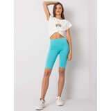 Turquoise cycling shorts. material composition: 90% polyester, 10% elastanewashing method: machine wash at 30CThe model is wearing a size S. Model's measurements: height 176.5 cm, bust 83 cm, waist 55 cm, hips 88 cm. Measurements of shorts in size S measured flat: waist width 31 cm, total length 52 cm