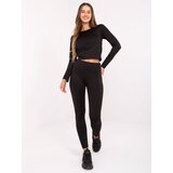 Black women's sports set. The set includes: top, leggingsmaterial composition: 90% polyester, 10% elastanewashing method: machine wash at 30CThe model is wearing a size S/M. Model's measurements: height 172 cm, bust 84 cm, waist 60 cm, hips 88 cm. Dimensions of the set in size S/M measured flat: waist width 32 cm, leggings length 96 cm, armpit width 37 cm, top length 44 cm, sleeve length 56 cm