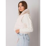 Ecru vest with hood. accessories: stowable hoodMaterial: 100% polyesterwashing method: machine wash at 30CThe model is wearing a size S/M. Model's measurements: height 173 cm, bust 80 cm, waist 62 cm, hips 86 cm. Dimensions of the vest in size S/M measured flat: width under the armpits 51 cm, total length 44 cm