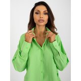 Light green women's oversize shirt with collar. Product code: TOKS7128.96Dominant pattern: plainStyle: Casualoccasion: casual, for work, for the city, for a date The model is wearing a size S. Model's measurements: height 168 cm, bust 89 cm, waist 60 cm, hips 91 cm. Measurements of the shirt in size S measured flat: armpit width 60 cm, sleeve length 59 cm, total length (front) 73 cm, total length (back) 80 cm.