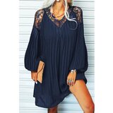 Kvalitetan i udoban materijal. Dugi široki rukavi stisnuti u području zapešća. Vizrez. Plisirana tkanina. Širok kroj. S čipkastim detaljima u području ramena i ovratnika. Dužina do sredine bedra. Sastav materijala: 100% poliester Boja: Tamno plava Dužina: Mini