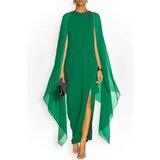 Sastav materijala: 80% poliester, 20% elastin. Periva u perilici. Duga modna haljina od jako ugodnog i mekanog materijala. Okrugli ovratnik. Kao modni dodatak prišiven prozirni materijal sa strane. Izrez sa strane. Skriven zatvarač na stražnjoj strani. Proizvod je u cijelosti proizveden u Italiji. Boja: Zelena Dužina: Maxi