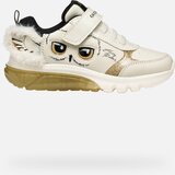 Girls' Geox Ciberdron sneakers inspired by the world of Harry Potter in a cream design with a motif of Hedwig the owl. Stylish elements such as two distinctive eyes on the side, black eyebrowlike curves and a golden shimmering stripe give the sneaker a unique character. The upper is complemented by a practical Velcro with the GEOX logo and soft fur in the heel area. Velcro eliminates the hassle of tying laces when dressing in the morning, while soft fur is reminiscent of Hedwig's feathers. The design inspired by Harry's faithful will delight every fan of the wizarding world. Harry Potter design with Hedwig the owl motif will delight fans of the wizarding series delight fans of the Wizarding seriesVelcro instead of laces quick and easy to put on without the help of parentsSoft fur on the heel reminiscent of owl feathers and ensures comfortGold sparkly details elegant accents for a girly styleRespira technology wicks away sweat during running and active gamesRespira technology perforated sole with membrane wicks away moisture and keeps feet fresh all day long. Suitable for school day, playing with friends n