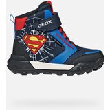Dark blue Geox Trekkyup ABX boys' ankle boots with Superman motifs for young superheroes. For active guys who love adventure and want to have their favorite characters on their feet. It combines the practicality of everyday wear with an attractive design inspired by DC Comics.Amphibiox waterproof technology keeps feet dry when playing in a puddle or walking in the rain ankle construction stabilizes the foot when running and jumping on the playgroundSuperman logo and lettering original DC Comics