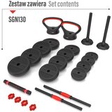 Utezi ukupne težine 20 kg izrađeni od kvalitetnih materijala. Diskovi su presvučeni plastičnim materijalom za dodatnu zaštitu. Osigurači i savršeno usklađen promjer otvora diska omogućuju brze promjene težine. Osigurači su navojni, ali imaju dodatno pojačanje, tako da se teret ne pomiče tijekom vježbanja. Dvije kratke šipke mogu se kombinirati u jednu dugačku. Ovo inovativno rješenje značajno proširuje mogućnosti vježbanja. Sve ručke i šipke opremljene su protukliznim materijalima. Vezni dio prekriven je ergonomski dizajniranom pjenom za maksimalnu udobnost tijekom vježbanja.