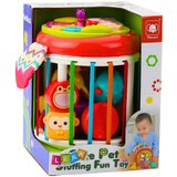 INTERAKTIVNA EDUKATIVNA KOCKA S RAZVRSTAVAČEM, GLAZBOM I ŽIVOTINJAMAInteraktivna edukativna kocka je multifunkcionalna senzorna igračka koja podržava razvoj djeteta od najranijih mjeseci. Dizajnirana je s idejom sveobuhvatne stimulacije osjetila, učenja prepoznavanja oblika, boja te razvoja koordinacije i manualnih sposobnosti.Na gornjem dijelu kocke nalazi se glazbena ploča s gumbima koji odgovaraju zvukovima dometa i ikonama životinja. Kada ih pritisnete, igračka proizvodi zvukove koji privlače djetetovu pažnju i uče uzročnoposljedičnim vezama. Ovdje ćemo pronaći i šarene kotačiće za predenje, zupčanike i ogledalo. Jedan od zidova sadrži materijalni otvor za pritiskanje blokova, što je jedinstven oblik taktilne igre.Set uključuje čak 7 različitih blokova približnih dimenzija 46 cm, s izbočinama, teksturama ili životinjskom grafikom. Svaki od njih ima drugačiji oblik i boju, što podržava razvoj vizualne i kognitivne percepcije.Konstrukcija kocke je čvrsta, izrađena od sigurnog materijala. Igračka nema oštrih rubova i u potpunosti je prilagođena potrebama najmlađih korisnika.SPECIFIKACIJA: Dimenzije pakiranja: 20 x 15 x 14,5 cm Dimenzije kocke: cca. 17 x 14 cm Napajanje: 2 x 1,5 V AAA baterije (nisu uključene) Materijal: ABS plastika, senzorna tkanina, gumeni elementi Funkcije: Glazbena ploča sa zvukovima, sortiranje oblika, tihi ulaz, rotirajući elementi, senzorni elementiSADRŽAJ SETA: Interaktivna edukativna kocka 7 blokova različitih oblika i tekstura Šareno poklon pakiranje