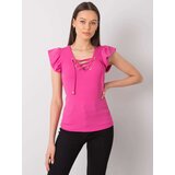 Pink blouse with a laceup neckline. Material Type: Ribbed Material: 95% Costina Nervure, 5% Elastanewashing method: machine wash at 30CThe model is wearing one size. Model's measurements: height 173 cm, bust 81 cm, waist 60 cm, hips 90 cm. Measurements of the blouse in one size measured flat: armpit width 34 cm, total length 56 cm