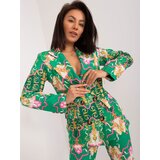 The model is wearing a size S. Model's measurements: height 164 cm, bust 88 cm, waist 62 cm, hips 90 cm. Dimensions of the set in size S measured flat: width of the jacket under the armpits 48 cm, sleeve length 57 cm, jacket length 66 cm, width of the pants at the waist 31 cm, waist height 29 cm, length of the pants 97 cm.