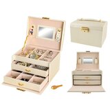 Kutija za nakit očit je izbor za sve dame koje se nikako ne mogu zasititi paru naušnica. Kutija vam omogućuje, da savršeno njegujete svoj nakit, zaštitite ga od oštećenja i ujedno ga lijepo izložite. Torbica se sastoji od uklonjive navlake s 2 pretinca za prstenje s valjcima, 4 pretinca za ostali nakit i uklonjive kutije. U donjem dijelu nalazi se 6 dodatnih pretinaca, 2 umetka za satove ili narukvice i 1 veliki, pravokutni pretinac za veće predmete. Pretinci su obloženi mekanim materijalom, koji štiti osjetljivi nakit od ogrebotina. Lako stane u svaku torbicu/kozmetičku torbicu i uvijek ga možete imati sa sobom. Unutar kućišta nalazi se sklopivo ogledalo. Idealan za stavljanje