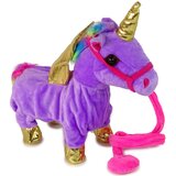 Mascot horse Interactive Unicorn Purple Golden WingsIs your child dreaming of their own pet? With this toy you will enable your little one to play with a smallsized furry animal without having to buy a real pet! Almost every child wants to own their own pet. This will be a very good test to check your child's caring and responsibility.The unicorn is made with the utmost care, purple in colour, soft to the touch with additional golden wings and colourful elements. The interactive horse is a soft fourlegged friend. The unicorn roars and plays a melody. After inserting the batteries, simply press the handle from the leash and it walks led on the leash, moving its tail and head, accompanied by friendly country music.Provides your child with hours of fun together and lots of positive emotions. Dimensions of the horse:30 cm x 12 cm x 33 cmPackage dimensions:31 cm x 13 cm x 34 cmThe toy unicorn is packaged in transparent foil. It is suitable for all children aged 3 years and over. The dog is CE certified, confirming that it meets the requirements of European Union directives. Complies with the EN71 standard. It is a very safe toy, with no sharp parts and pleasant to the touch. To play with the unicorn you need 4 1.5V "AA" batteries.