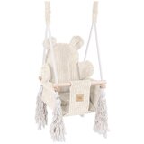 Dječja ljuljačka Meowbaby donosi sigurnu i radosnu zabavu za mališane ravno u vaš dom. Izrađena je od prirodnih materijala, i to mekog korduroja i izdržljivih drvenih elemenata, koji osiguravaju udobnost i stabilnost tijekom svakodnevne upotrebe. Lagana konstrukcija i visokokvalitetna izrada omogućuju jednostavnu ugradnju. Sjedalo je ojačano skrivenom drvenom pločom koja sprječava savijanje i podržava pravilno držanje. Za maksimalnu sigurnost, ljuljačka je opremljena integriranim sigurnosnim pojasevima i mekim platnenim ručkama koje omogućuju djetetu da je sigurno uhvati tijekom igre. Na naslonu se nalaze i slatke uši koje podsjećaju na medvjedića. Zahvaljujući mekom podstavku i pravilnoj potpori leđa, ljuljačka je prikladna za djecu od otprilike 6 mjeseci starosti, uvijek pod nadzorom odrasle osobe. Lagano ljuljanje potiče razvoj ravnoteže i motoričke koordinacije, a istovremeno potiče opuštanje. Uže za vješanje izrađeno je od pamučnih užadi debljine 9 mm, koje su izdržljive i nježne za dječje ruke. Cjelokupni izgled nadopunjuju debele rese u boho stilu, koje su ručno izrađene i dodaju šarm ljuljački. Paket također uključuje set za montažu koji uključuje kuke ili posebne držače za brzu i jednostavnu ugradnju.