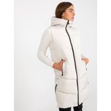 Cream long down vest with a hood. Product code: NMKZP226608.98PDominant pattern: plainStyle: Casualoccasion: casual, city, walk, work The model is wearing a size S. Model's measurements: height 177 cm, bust 92 cm, waist 63 cm, hips 93 cm. Dimensions of the vest in size S measured flat: width under the armpits 51 cm, total length 92 cm.