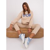 Beige twopiece women's tracksuit set. Product code: EMKMPL802.97PDominant pattern: plainStyle: Casualoccasion: casual, city The model is wearing one size. Model's measurements: height 176 cm, bust 85 cm, waist 64 cm, hips 92 cm. Dimensions of the set in one size measured flat: width of the sweatshirt under the armpits 53 cm, sleeve length 60 cm, length of the sweatshirt 67 cm, width of the pants at the waist 38 cm, waist height 29 cm, length of the pants 90 cm.
