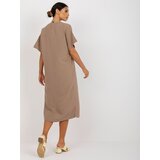 Dark beige simple dress with a V OCH BELLA neckline. Additional features: slit Product code: TWSKBEAZ101.40PDominant pattern: plainStyle: Casualoccasion: casual, city, walk, summer The model is wearing a size S. Model's measurements: height 168 cm, bust 89 cm, waist 60 cm, hips 91 cm. Measurements of the dress in size S measured flat: width under the armpits 56 cm, total length (on the left side) 111 cm, total length (on the right side) 85 cm.