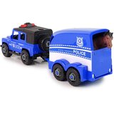 Od sada, svi ljubitelji policijskih vozila, moći će se uživjeti u ulogu policajca i krenuti u policijsku akciju. Transporter je spreman za ukrcaj policijskih konja i njihov prijevoz na mjesto odgovarajuće policijske akcije.Izvrsna značajka je mogućnost rastavljanja i uvrtanja vozila. Mališan će moći razviti svoje manuelne i precizne vještine, kao i svoje logično razmišljanje i maštu.Terenski automobil lako će prevesti policijske konje. Vozilo je opremljeno vijcima koji pričvršćuju pojedine komponente vozila. U setu se nalazi odvijač, kojim se automobil može odvrnuti i odvrnuti. Uvrtanjem vijaka mališan vježba ruke koje će ga pripremiti za buduće učenje pisanja i razvija funkciju ruke.Poluprikolica je ugrađena s poklopcem za otvaranje, tako da se figurica može bez problema stavljati i vaditi. Može se odvojiti u bilo kojem trenutku i igrati se sa samim terenskim automobilom.Elementi skupa: kamion transporter konj OdvijačDimenzije automobila:17 cm x 8 cm x 10 cmDimenzije nosača:17 cm x 10 cm x 11 cmDimenzije konja:13 cm x 4 cm x 11 cmDimenzije paketa:37 cm x 17 cm x 12 cmSve komponente korištene u proizvodnji igračke su neotrovne i sigurne za dijete, što potvrđuje i CE certifikat koji je dan proizvodu. Igračka je prikladna za svu djecu stariju od 3 godine.