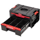 Prostrana modularna kutija s dvije ladice s metalnim vodilicama pruža dovoljno prostora za organiziranje radioničkog pribora. Kutija ima jednu nisku i jednu visoku ladicu, koje su opremljene s pet podesivih pregrada i držačem etikete za bolju organizaciju pohranjenih stvari. Automatski sustav zaključavanja ladica i praktična ručka olakšavaju rukovanje kutijom. Bočni konektori od poliamida omogućuju jednostavno spajanje na druge module Qbrick kutija, što olakšava izradu kompleta koji odgovara vašim potrebama.