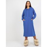 Dark blue midi sports basic dress with a hood. Product code: RVBL8335.58PDominant pattern: plainStyle: Casualoccasion: casual, city, walk, work The model is wearing one size. Model's measurements: height 175 cm, bust 84 cm, waist 61 cm, hips 91 cm. Measurements of the dress in one size measured flat: armpit width 65 cm, sleeve length 62 cm, total length 113 cm.