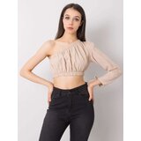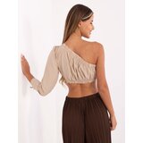 RUE PARIS Beige top with an asymmetrical neckline. Material: 100% cottonwashing method: machine wash at 30CThe model is wearing a size S. Model's measurements: height 173 cm, bust 78 cm, waist 60 cm, hips 90 cm. Measurements of the top in size S measured flat: armpit width 38 cm, total length 29 cm, sleeve length 54 cm