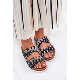 Patterned women's slippers made of textile material, set on a cork platform that combines comfort with a fashionable look. Two straps with buckles decorated with glitter add a unique character. The contoured suede insole ensures comfort throughout the day. These slippers will be an excellent choice for summer days, perfectly matching dresses, skirts, or shorts, bringing lightness and shine to every outfit. When choosing a size, please refer to the size chart.3623/3723,5/3824,5/3925/4025,5/4126cm
