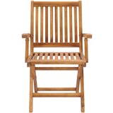 Ovaj set drvenih vrtnih stolica ima bezvremenski dizajn. Vanjske stolice uklopit će se u svako okruženje, poput kuća, ureda, barova i kafića, zahvaljujući svom jednostavnom, ali elegantnom dizajnu. Izrađen od izuzetno izdržljivog tvrdog drva tikovine, ovaj set namještaja obrađen je, osušen u peći i fino izbrušen kako bi dobio gladak izgled. Tikovina je poznata po izuzetnoj čvrstoći i otpornosti na vremenske uvjete, što je čini daleko prikladnijom za vrtni namještaj od bilo koje druge vrste drva. Savršen je izbor ako želite kupiti dugotrajan komad vrtnog namještaja. Zahvaljujući brušenoj površini, blagovaonske stolice otporne su na vremenske utjecaje i lako se čiste. Također se mogu sklopiti radi uštede prostora za pohranu kad se ne upotrebljavaju. Štoviše, uključeni jastuci pružaju dodatnu udobnost. Svaki jastuk ima 2 seta vezica za snažno pričvršćivanje za stolicu. Napomena: Kako biste produžili vijek trajanja svog vanjskog namještaja, preporučujemo vam da ga redovito čistite i ne ostavljate ga nepotrebno na otvorenom bez zaštite.Čišćenje: Upotrijebite blagu otopinu sapunaPohrana: Ako je moguće, čuvajte na hladnom i suhom mjestu u zatvorenom. Ako se proizvod čuva na otvorenom, zaštitite ga vodootpornom navlakom. Obrišite i osušite višak vode ili snijega s ravnih površina nakon kiše ili snijega. Omogućite dovoljnu cirkulaciju zraka kako biste izbjegli oštećenja od vlage.