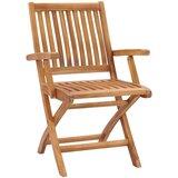 Ovaj set drvenih vrtnih stolica ima bezvremenski dizajn. Vanjske stolice uklopit će se u svako okruženje, poput kuća, ureda, barova i kafića, zahvaljujući svom jednostavnom, ali elegantnom dizajnu. Izrađen od izuzetno izdržljivog tvrdog drva tikovine, ovaj set namještaja obrađen je, osušen u peći i fino izbrušen kako bi dobio gladak izgled. Tikovina je poznata po izuzetnoj čvrstoći i otpornosti na vremenske uvjete, što je čini daleko prikladnijom za vrtni namještaj od bilo koje druge vrste drva. Savršen je izbor ako želite kupiti dugotrajan komad vrtnog namještaja. Zahvaljujući brušenoj površini, blagovaonske stolice otporne su na vremenske utjecaje i lako se čiste. Također se mogu sklopiti radi uštede prostora za pohranu kad se ne upotrebljavaju. Štoviše, uključeni jastuci pružaju dodatnu udobnost. Svaki jastuk ima 2 seta vezica za snažno pričvršćivanje za stolicu. Napomena: Kako biste produžili vijek trajanja svog vanjskog namještaja, preporučujemo vam da ga redovito čistite i ne ostavljate ga nepotrebno na otvorenom bez zaštite.Čišćenje: Upotrijebite blagu otopinu sapunaPohrana: Ako je moguće, čuvajte na hladnom i suhom mjestu u zatvorenom. Ako se proizvod čuva na otvorenom, zaštitite ga vodootpornom navlakom. Obrišite i osušite višak vode ili snijega s ravnih površina nakon kiše ili snijega. Omogućite dovoljnu cirkulaciju zraka kako biste izbjegli oštećenja od vlage.