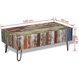 Ovaj drveni stolić za kavu u antiknom stilu bit će jedinstven dodatak vašoj dnevnoj sobi. Stolna ploča od masivnog drva i snažne željezne noge čine ga stabilnim i čvrstim prostorom na koji možete staviti piće, vazu, košaru s voćem ili ukrasne predmete. Također se može upotrebljavati kao bočni stolić ili stolić za dnevni boravak. Stolna ploča napravljena je od obnovljenog drva, što znači da je svaki komad namještaja jedinstven i pomalo drukčiji od sljedećeg. Namještaj izrađen od obnovljenog drva ima karakteristike raznih vrsta drva, kao što su tikovina, drvo manga i bagrema. Obnovljeno je drvo čvrsto, stabilno, izdržljivo i lijepo. Znakovi trošenja i vidljiva struktura godova daju svakom komadu vlastitu povijest i jedinstven izgled. Stolić za kavu je potpuno ručno izrađen, a to doprinosi spektakularnom retro stilu. Svaki korak procesa je izrađen s najvećom pažnjom, uključujući rekombiniranje, poliranje, bojenje ili lakiranje voskom. Važna napomena: Boje se razlikuju od primjerka do primjerka, što čini svaki naš stolić za kavu jedinstvenim. Primjerci se dostavljaju slučajnim odabirom.