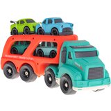 DescriptionBIOplastik tow truck + carsAn interactive tow truck with four cars in a set, made of BIOplastic, is a proposition for children from 18 months of age. The tow truck has sound effects such as sounds of starting the engine, reversing, honking, a cheerful melody, and lighting effects in the form of flashing lights at the front of the vehicle. We can detach the tow truck from the vehicle. The toy is powered by 3 x LR44 batteries, which are included in the set.The main advantages of toys made of BIO plastic: nontoxic, safe for the baby, durable.Dimensions car with trailer approx. 32 cm x 13.5 cm x 11.5 cm, car without trailer, approx. 16.5 cm x 12.5 cm x 11 cm, trailer approx. 23 cm x 12.5 cm x 11 cm, cars approx. 9.5 cm x 5.5 cm x 5 cm, package approx. 37.5 cm x 21 cm x 13.5 cm.Set contents BIOplastic tow truck, 4 cars.