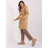Camel long winter jacket with belt . Product code: NMKRTR510.38XDominant pattern: no patternStyle: Casualoccasion: everyday, for the city, for a walk Material composition upper: 100% nylonLining Material: 100% Polyester The model is wearing a size S. Model's measurements: height 172 cm, bust 88 cm, waist 63 cm, hips 92 cm. Measurements of the jacket in size S measured flat: armpit width 55 cm, total length 95 cm, sleeve length 59 cm.