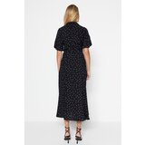 V dekolte 3/4 rukavi s volanima na kopčanje gumbima remen točkast uzorak prorezi na suknji Materijal: 90% viskoza 10% poliester Dimenzije modela: Visina: 178 Grudi: 83 Struk: 59 Bokovi: 88 Veličina uzorka: S / 36