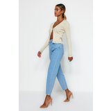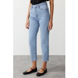 Ženske Mom traperice  na kopčanje patentnim zatvaračem i gumbom 2 prednja džepa 2 stražnja džepa Dimenzije modela: visina: 176 prsa: 80 struk: 64 bokovi: 90 Veličina proizvoda na modelu: S / 36 Materijal: 100% pamuk