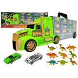 Truck Transporter Sorter Suitcase with Dinosaurs GreenIf your child is a fan of prehistoric dinosaurs this would be the perfect set for them. The transporter is ready to load up the dinosaurs and transport them to the right place. The sorter truck will be a sensational gift for a child who loves Jurassic Park and ancient, huge creatures. The transporter has many functions that your child will be curious to explore. Two additional cars will make it possible for you to have an extraordinary adventure together with the dinosaurs.This is a unique and very interesting toy, the additional elements from the life of the dinosaurs can also instil interest .The multifunctional car will look great in your child's collection, standing out above all for its design, its range of uses and its equipment.Set elements: truckdinosaurs 10 different types 2 types of striped carsDimensions of the truck:53 cm x 16 cm x 10 cmPackage dimensions:59 cm x 20 cm 11 cmAll components used in the production of the toy are nontoxic and safe for the child, as confirmed by the CE certificate given to the product. The toy is suitable for all children over 3 years old.