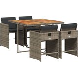 Ovaj vrtni blagovaonski set izvrstan je izbor za objedovanje na otvorenom ili jednostavno za opuštanje u vrtu, dvorištu ili na terasi. Izdržljiv materijal: PE ratan, poznat i kao poliratan, jak je sintetički materijal kojem je potrebno malo održavanja i izgleda poput prirodnog ratana. Lagan je, jednostavan za čišćenje i često se upotrebljava za vanjski namještaj zbog svoje izdržljivosti i svojstava otpornosti na vremenske uvjete.Kompaktna pohrana: Ove stolice imaju preklopni naslon koji se može sklopiti, što olakšava njihovo spremanje ispod stola. Kada su sklopljene, uredno stanu ispod stola, tvoreći oblik kocke koji štedi prostor.Udobno sjedenje: Ovaj vanjski namještaj, zajedno s debelo podstavljenim jastucima, nudi udobno iskustvo sjedenja.Uklonjiva i periva navlaka: Ovi jastuci za sjedalo imaju uklonjive navlake za jednostavno pranje i održavanje. Navlake za jastuke za stolice imaju preklop na stražnjoj strani za jednostavno pričvršćivanje na stolice.Stabilna ploča stola koja se lako čisti: Ovaj vrtni stol ima ploču stola od bagremovog drva koja je čvrsta, izdržljiva i lako se čisti vlažnom krpom. Dobro je znati: Kako bi vaš vanjski namještaj ostao lijep, preporučujemo da ga zaštitite vodootpornom navlakom.