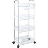 Ova kolica za pohranu nude idealno rješenje za organiziranje različitih prostora uključujući kuhinju, dnevni boravak, kupaonicu, praonicu i ured.Lagana i izdržljiva: Izrađena od robusnih akrilnih košara i okvira od nehrđajućeg čelika, ova kolica za pohranu su lagana, stabilna i izdržljiva.Svestrana uporaba: Ova kolica za pohranu su svestrana i mogu se koristiti u različitim okruženjima, kao što su kuhinja, dnevni boravak, kupaonica i ured. Može vam pomoći da stvari poput hrane, knjiga, toaletnih potrepština i uredskog pribora budu uredno pohranjene i lako dostupne.Dodatna pohrana: Ova pomoćna kolica imaju dvije dodatne viseće čašice za pohranu malih predmeta poput noževa, vilica, žvakaćih guma, ključeva i više, čime se optimizira iskorištenje prostora.Jednostavno kretanje i sigurno parkiranje: Ova kolica za pohranjivanje opremljena su s četiri kotačića, od kojih dva imaju kočnice, što vam omogućuje da ih bez napora premjestite na bilo koje željeno mjesto i sigurno zaključate na mjestu za dodatnu kontrolu i sigurnost.Praktične ručke: Ova kolica za pohranu dizajnirana su s dvije ručke na vrhu, što vam olakšava guranje i povlačenje za prikladnu mobilnost.