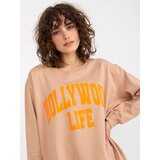 Beige and orange long oversize sweatshirt with a slogan . Product code: VIBL3102.01PDominant pattern: printStyle: Casualoccasion: everyday, for the city, for a walk The model is wearing one size. Model's measurements: height 177 cm, bust 84 cm, waist 62 cm, hips 89 cm. Measurements of the one size sweatshirt measured flat: armpit width 65 cm, sleeve length 58 cm, total length (front) 75 cm, total length (back) 86 cm.