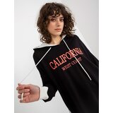 Black long oversize sweatshirt with a slogan and a hood. Product code: VIBL327.70PDominant pattern: plainStyle: Casualoccasion: casual, for a walk, for the city The model is wearing one size. Model's measurements: height 177 cm, bust 84 cm, waist 62 cm, hips 89 cm. Measurements of the one size sweatshirt measured flat: armpit width 67 cm, sleeve length 59 cm, total length 84 cm.