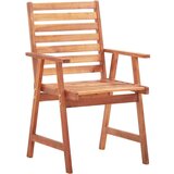 Ovaj suvremeni set drvenih blagovaonskih stolica s jastucima dodat će dašak prirodnog stila vašem vrtu, terasi ili dvorištu. Ovaj set drvenih stolica bit će odličan izbor za objedovanje na otvorenom. Ove vrtne stolice napravljene su od masivnog bagremovog drva, tropskog tvrdog drva, otpornog na vremenske prilike i izdržljivog za dugogodišnju upotrebu. Površina premazana uljem lako se čisti vlažnom krpom. Rešetkasti dizajn donijet će rustični šarm. Štoviše, uključeni jastuci pružaju dodatnu udobnost tijekom sjedenja. Napravljeni su od 100 % poliestera koji je tretiran kako bi bio vodootporan. Svaki jastuk ima dva seta vezica za snažno pričvršćivanje za stolicu. Napomena: Kako biste produžili vijek trajanja svog vanjskog namještaja, preporučujemo vam da ga redovito čistite i ne ostavljate ga nepotrebno na otvorenom bez zaštite.Čišćenje: Upotrijebite blagu otopinu sapunaSpremanje: Ako je moguće, čuvajte na hladnom i suhom mjestu u zatvorenom. Ako se proizvod čuva na otvorenom, zaštitite ga vodootpornom navlakom. Obrišite i osušite višak vode ili snijega s ravnih površina nakon kiše ili snijega. Omogućite dovoljnu cirkulaciju zraka kako biste izbjegli oštećenja od vlage.