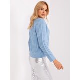 Light blue sweater with braided patterns. Product code: ATSW23462.99Pdominant pattern: braidsStyle: Casualoccasion: casual, city, walk, school The model is wearing one size. Model's measurements: height 175 cm, bust 90 cm, waist 66 cm, hips 94 cm. Measurements of the sweater in one size measured flat: armpit width 51 cm, sleeve length 54 cm, sweater length 57 cm